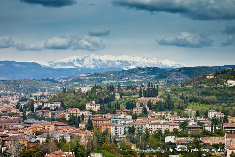 Let's go upstairs to the top of the Lamberti tower. In 1403 the tower was hit by a lightning that destroyed its upper part. It was recostructed only in the second half of the century and it made the tower higher than it used to be. Today it's 84 m high what makes it to be the highest building in Verona. The parts of various construction stages are seen at the exterior due to different materials used in different epochs. Lower part - bricks and tufaceous blocks, higher - only bricks and marble on the top. The big clock were hung on the tower in 1779.